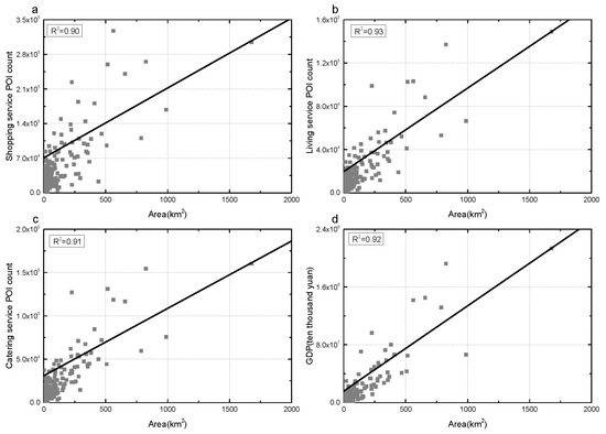 To detect the relationships between the urban areas extracted via our method and social interactions or human activities, three human activity variables covering most aspects of daily human life are extracted: shopping service POI, living service POI, and catering service POI, and the spatial patterns are statistically analyzed at the prefectural level, as indicated in Figure 8a–c. It is noticeable in these figures that most of the derived urban areas (the black polygons) are located in the prefectures with the bigger circles (indicating bigger counts of POI). It indicates that the delineated cities have strong connections with social interactions in the visual view. The further study explores the statistical correlations between the urban areas delineated by the proposed method and the counts of these three kinds of POI across the cities in China.