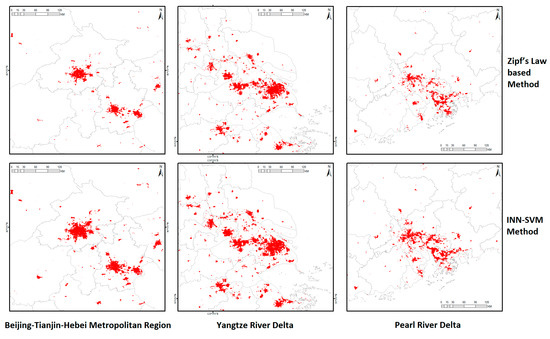 The urban areas extracted using the INN-SVM method [30] and those derived by the Zipf’s Law-based method.