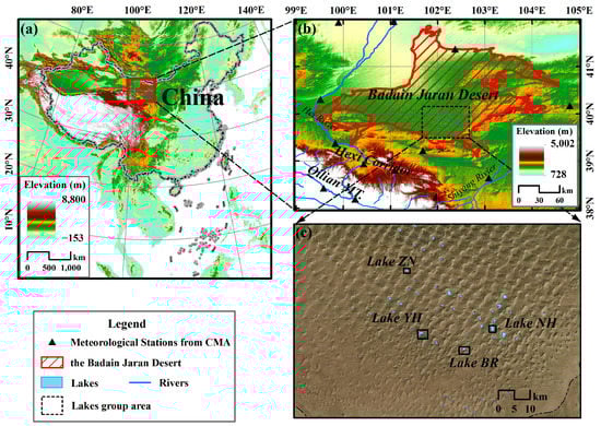 (a,b) The location of the BJD (Badain Jaran Desert) region in China; (c) the location of the lake group area in the BJD and four lakes where the lake water level was monitored by in situ instruments in this study.