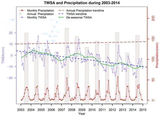 Monthly TWSA (solid blue line) averaged over the BJD from 2003 to 2014 with a green line indicating the smoothed and deseasonalized TWSA. The dark blue dashed line is the linear trend of the deseasonalized TWSA. The red line is the monthly precipitation and gray bars are the annual accumulated precipitation.