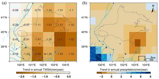 (a) Spatial trends in annual TWSA from 2001 to 2014; (b) and in annual precipitation from 2001 to 2014 over the BJD study area. The blue lines represent rivers and the gray dashed lines stand for the boundary of the BJD.