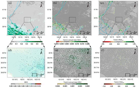 Spatial distributions of mean NDVI (a,d); significant NDVI annual trends (p < 0.05) (b,e); and the RUEmo trends (c,f) over the BJD and lake group area from 2001 to 2014 (p < 0.05).