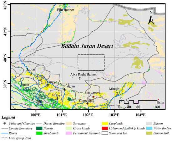 The study area (approximately 22.6 × 104 km2) covers the BJD and parts of the Hexi Corridor and the Qilian Mountains (38°N–42°N, 99°E–105°E) (Figure 1). The climate in the study area varies with topography and environmental gradients. From the BJD to the Qilian Mountains, there is a significant increment in precipitation (from 40 mm to 700 mm) with increasing altitude and decreasing latitude. The Hei River and Shiyang River are the main surface water sources originating from the Qilian Mountains, running through the Hexi Corridor, and terminate at the edge of the BJD. Runoff and melted snow water from higher altitudes are the main water supplies for these rivers. Driven by the water availability of rivers, cities and oases are distributed along the Hexi Corridor. The Hexi Corridor is an important sector of the Silk Road and the New Asia–European Railway, and it has five administrative areas including the Jinchang Region, Wuwei Region, Zhangye Region, Jiayuguan Region, and Jiuquan Region. The population of the Hexi Corridor increased from 3.8 million in 1985 to 4.86 million in 2015. Apart from the barren lands, croplands are the main land cover type in the Hexi Corridor. Due to the rapid increase in population and cultivation of lands, water usage has exceeded the water resources carrying capacity here.