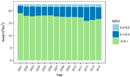 Variations in the areas with different NDVI ranges (>0.1) from 2001 to 2014 over the study region.