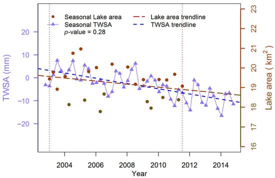 We selected the TWSA pixels that cover the entire Lake Group area and averaged the monthly data into four seasons (Figure 8). We found that the total lake area varied between 17.96 km2 to 20.97 km2 during 2001 to 2014. The Mann-Kendall test was used to detect the seasonal variations in the lake area, of which the results showed that the lake area had an overall decreasing trend but that it was not statistically significant (p-value = 0.28). Thus, despite the decreasing trend in the TWS, we found that the lake area over the BJD seemed to be stable over the years. This result was also corroborated by a recent study monitoring global surface water changes based on Landsat images acquired during a recent 30-year period, which observed no significant decrease in the Lake Group area in the BJD [72,73].