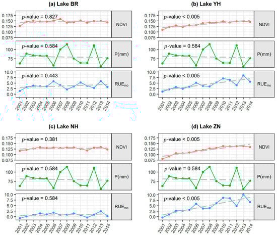 Annual average values of NDVI (red lines), precipitation (green lines), and the RUEmo (blue lines) from 2001 to 2014 over the four selected lake basins of (a) Lake BR; (b) Lake YH; (c) Lake NH; and (d) Lake ZN.