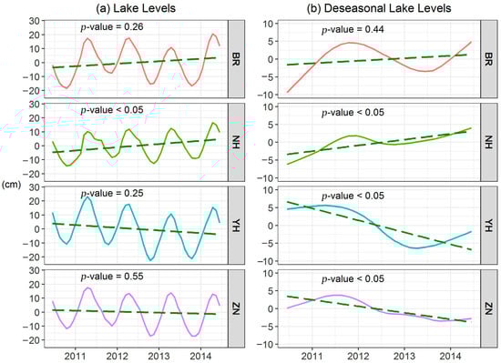 (a) The aggregated monthly in-situ lake water levels of the four lakes (Lake BR, Lake NH, Lake YH, and Lake ZN) from June 2011 to June 2015; (b) The deseasonalized lake water levels of the four lakes during the observation period with the green dashed lines representing the linear trends of lake water levels.