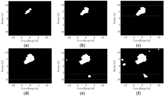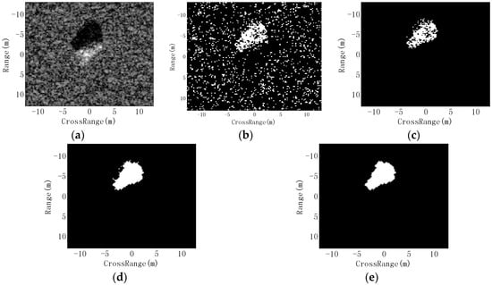Figure 3 illustrates the shadow segmentation of an SAR image of a BMP2 target from the MSTAR dataset. After the threshold segmentation, t many false alarms from the background remain as shown in Figure 3b. The count filter eliminates most of the false alarms and produces a disconnected shadow (Figure 3c). The morphological closing operation connects the shadow region (Figure 3d), and Figure 3e is the final shadow region after the morphological opening operation.