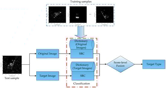 As a decision fusion strategy, the score-level fusion is demonstrated effective in several relevant literatures [10,39,40]. In the proposed classification scheme for the information-decoupled representations, the merit of SRC, such as good robustness to noise corruption and partial occlusions, can be inherited. Moreover, the score-level fusion can effectively combine the advantages of the original and target images. Therefore, it is predicable that the proposed method can improve the effectiveness and robustness of the SAR ATR. The detailed procedure of the proposed method is illustrated in Figure 5. Considering the high dimensionality of the original image and target image, random projection [21,33,47] is used to reduce the dimension. As indicated in [47], the random projection is a good “partner” for “compressive classification” including SRC. To solve the sparse coefficients, the OMP algorithm is used, which is demonstrated to be effective in SAR ATR [21,34,39,40].