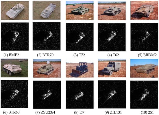 The MSTAR dataset is used for performance evaluation in this paper, and includes the SAR images of ten classes of ground targets collected by the X-based SAR sensors. The SAR images have a resolution of 0.3 m × 0.3 m, covering the full azimuths from 0° to 359° at two depression angles of 15° and 17°. The optical images and corresponding SAR images of the ten targets are shown in Figure 6. Available samples of the ten targets in the training and test sets are summarized in Table 2.