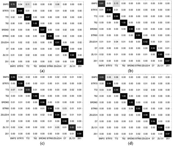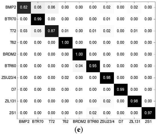 In real-world scenarios, many cases of SAR ATR are performed under EOCs. Therefore, it is important that the designed SAR ATR algorithms can handle various EOCs [1,37,48,49]. In this subsection, the proposed method is tested under two typical EOCs: configuration variance and depression angle variance.