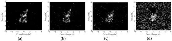 SAR images of 2S1 at different depression angles: (a) 15°; (b) 17°; (c) 30°; and (d) 45°.