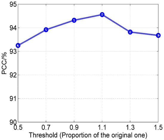 In the proposed shadow extraction method in Section 2.2, the threshold is set to be the mean of the entire intensities. The change of the threshold will cause irregular deformations to the extracted shadow. For the experimental evaluation, the threshold is set to be 50%, 70%, 90%, 110%, 130% and 150% of the original one, and then the PCC of the proposed method is calculated at each threshold. Figure 10 shows the results of shadow segmentation at different thresholds. Unlike the morphological erosion results in Figure 9, the shadow deforms nonuniformly with change of the threshold. The average PCCs of the proposed method at different thresholds are plotted in Figure 11, in which the x coordinate represents the proportion of the original threshold. At a notably low threshold, some of the shadow pixels are not correctly segmented. Then, the generated target image still contains many shadow pixels, which causes some degradation to the proposed method. In contrast, at a notably high threshold, some target and background pixels will be segmented as the shadow region, which also results in the incorrectness of the target image. However, the PCCs at different threshold can remain higher than 93%, which indicates the robustness of the proposed method to changing thresholds. The performance of the proposed method is related to the precision of the generated target image. Although some background pixels are segmented as the shadow, as shown in Figure 10f, the target image can be properly generated. Then, there is only a small decrease in the PCC. In comparison, when more shadow pixels are not correctly separated out (e.g., Figure 10a), the generated target image has lower precision. However, because of the fusion of original image and target image, the proposed method can maintain good performance.