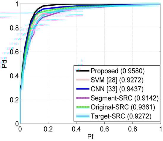 As shown in Figure 12, when the Pf is lower than 0.4, the Pd obtained using the proposed method is significantly higher than the ones obtained using the reference methods. To quantitatively evaluate the outlier rejection performance, the area under the ROC curves is calculated as the average precision (the numbers in the brackets in Figure 11). With the maximum average precision, the proposed method is demonstrated most robust on outlier rejection. The score-level fusion of the original and target images effectively enhances the separability between the “in-class” targets and outliers. Therefore, the proposed method is more capable of rejecting outliers.