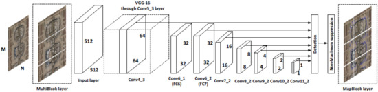 Figure 1. Airplane detection framework. We add a MultiBlock layer and MapBlock layer based on the SSD (Single Shot MultiBox Detector). After the MultiBlock layer, each block is resized to 512 × 512. As is shown, we use VGG (Visual Geometry Group) 16 as the base network. The prediction result of each block is mapped back to the original image after passing the MapBlock layer. - A method is proposed to solve the size restrictions of the input images, which first divides the image into blocks and then detects the airplane.