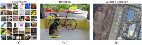Transfer learning. The model trained by classification tasks can be used as our base network, and then the object detection framework in the natural image can be used to detect the airplane in the remote sensing image. (a) ImageNet dataset used for classification [4]; (b) the object detection result of a natural image, using YOLO (You Look Only Once); and (c) airplane detection in this paper.
