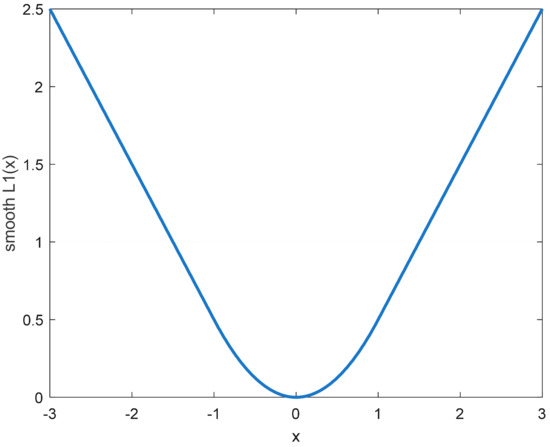 Here, represents the ground truth box, represents the default box, and represents the offset of the predicted box relative to the default box. The curve of the Smooth L1 loss is shown in Figure 5, which has the advantage of being less sensitive to outliers than the L2 loss.