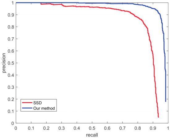 The Precision-Recall (PR) curve. The blue curve is the result of our method on the test set and the red one is the SSD. It can be seen that with the same precision, our method has an obvious advantage in the recall rate.