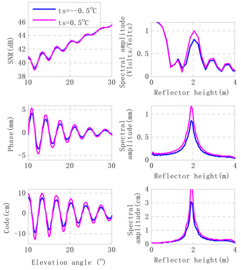 The forward GPS multipath simulator developed by Nievinski and Larson [37,38] is employed for theoretical simulations. GPS multipath observables corresponding to the changes of soil temperatures are simulated in this section. Different soil temperatures (−1 °C and 1 °C) are set for comparisons (Figure 2). A Trimble receiver is used for the simulation, while the height of the antenna is 2.0 m and the antenna model is “TRM41249.00”. Effects of soil temperature on GPS multipath observables are given in this Section, and we also evaluate the multi-frequency effects on GPS multipath observables.