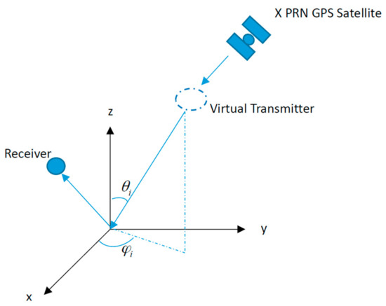 Illustration of virtual bistatic radar by the receiver and virtual transmitter. At any time, one or more GPS satellites (X PRN: X presents the temporal PRN number) will fall into the position of virtual transmitter with the incident azimuth and zenith angles and , respectively.