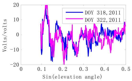 Two representative days are chosen for comparisons. On DOY 318, the soil temperature is 0.2 °C, while the soil became frozen on DOY 322. Their corresponding mean detrended SNR changes are given in Figure 7. As the soil changes from melt state to frozen state, it will result in the variations of GPS SNR modulation pattern (Figure 7), not only the amplitude but also the phase shift, and they are related to the elevation angles.