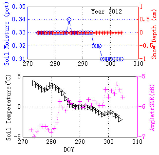 In the bare soil freeze/thaw process, it is often accompanied by the occurrence of snowfall. It is known that snow depth affects the GPS multipath observables, so we should exclude snow effects in the analysis of soil freeze/thaw process. The periods when there is no snow or the same snow depth, are specially chosen for analysis. Soil moisture is also an important factor that should be considered in the investigation, since it also affects the GPS multipath metrics. To eliminate the soil moisture effects, for the chosen periods, small variations or no variations of soil moisture are specially chosen, and its effects on the final GPS multipath observables can be ignored. As for the soil temperature, we have only chosen those time periods when soil freeze/thaw process has happened.