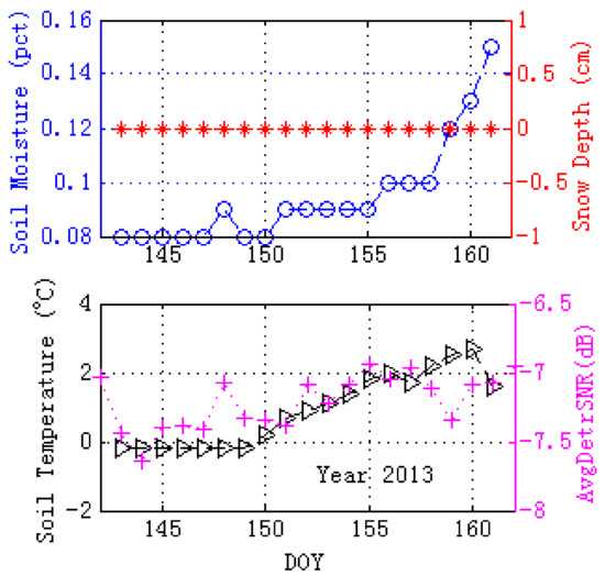 The upper panel of Figure 10 presents the comparisons between GPS site AB33 and SNOTEL site 958 on DOY 142 (2013) and DOY 162 (2013). The elevation angle is 20°. There was no snow and the soil moisture changed from 0.08 to 0.15 during these periods, which will result in small variations of dielectric properties. When the soil changed from frozen state to thawed state, the relevance between soil temperature (frozen state to thawed state) and GPS SNR data can be represented in the bottom panel, and the ADSNR data (direct signals have been removed) have a corresponding increasing trend. Although the correlation in 2013 is not as good as in 2012, there is still a good relevance between soil temperature and ADSNR data with the correlation coefficient of 0.65.