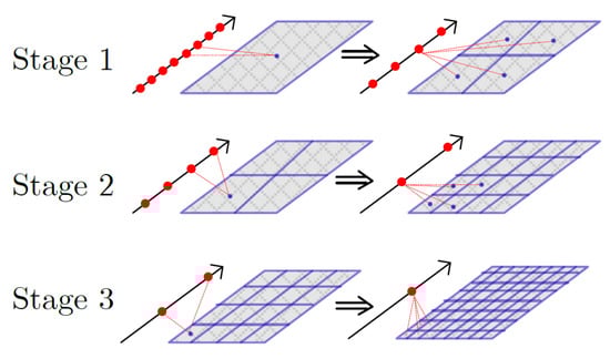 The left image in Figure 3 shows an example of subaperture summation where the factorization factor is two. The platform runs along the y-axis; the x-axis is the range direction; and the z-axis denotes the height dimension. The new subaperture at is the summation of subapertures at and . The number of pivots along the range dimension is n, and a pivot can be denoted as . In this accelerated BP algorithm, the number of pivots is fixed during the focusing process, which is different from Block_FFBP, wherein the number of reference points grows with an increase in the number of factorization stages.