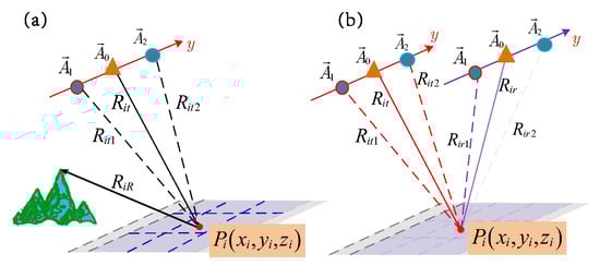 Bistatic SAR cases: (a) one-stationary bistatic mode; (b) azimuth-invariant bistatic mode.