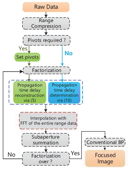 Figure 5 presents the flowchart of proposed algorithm. The green and cyan blocks represent processing with and without pivots, respectively. Range compression is conducted in the first stage. The number of factorization stages and the factorization factor in each stage are set. For the general case, pivots are required. According to Equation (5), an interpolation function is used to calculate the delay time of the “new” subapertures, which corresponds to the propagation time delay reconstruction in Figure 5. Specifically, when the platform runs along a straight track, pivots are not required, and in the factorization stage, delay time is determined according to Equation (10). After the propagation time delay relationship is established, range data interpolation is performed using an FFT followed by the subaperture summation. When the factorization is done, a conventional BP algorithm is applied to focus the new synthetic data, and a final focused image is obtained.