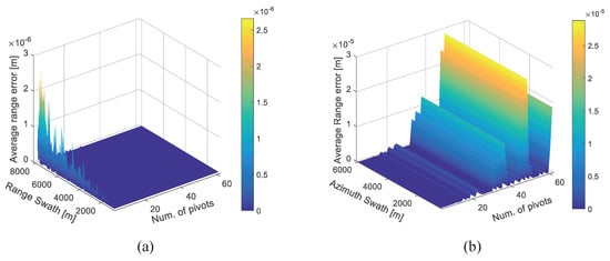 During the factorization and subaperture summation process, the accuracy of signal propagation time between the “new” and “old” subapertures could affect the final image quality. In Block_FFBP, the slant range computation error changes across the data block. In the proposed algorithm, the accuracy of slant range can be ensured by the interpolation, which is described in Equation (5). To evaluate the influence of the chosen number of pivots, slant range computation errors between “new” and “old” subapertures are calculated in the condition of different swaths and different number of pivots. Assume that the platform height is 8 km, the look angle is and the subaperture offset is 400 m. The interpolation scheme is a spline function.
