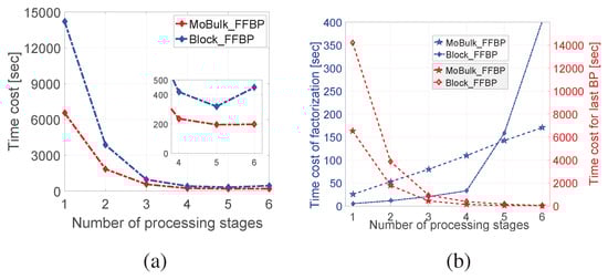Comparative analysis of the execution times of Block_FBP and MoBulk_FBP. (a) The total processing time when . (b) Time costs of the factorization and residual BP.