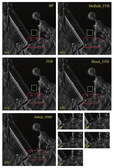 After the point target simulation, the raw data of synthesized distributed scene containing land and water are generated. Figure 11a–d shows the focusing results, which are processed using BP, MoBulk_FFBP, FFBP and Block_FFBP, respectively. In the red rectangle in each figure, the focusing quality of Block_FFBP is not as good as the others due to the residual phase error induced by the changing range error. The water area in the green rectangle is used for SNR comparison. From Figure 11a–d, the measured SNR is 22.83 dB, 22.78 dB, 22.46 dB and 22.61 dB. although the SNR of each result are similar, the SNR of MoBulk_FFBP is a little better. However, the focusing performance can be validated by the area in the red rectangle.