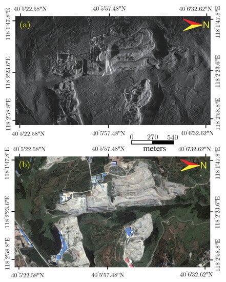 Monostatic spotlight image processed using MoBulk_FBP. (a) The monostatic spotlight image; (b) the optical image of the imaging area from Google Earth.