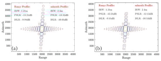 The results processed by the FBP in [25] and the proposed BiBulk_FFBP are shown in Figure 13. To evaluate the IRW, PSLR and ISLR, the contours of the point at left-up corner are enlarged and shown in Figure 14.