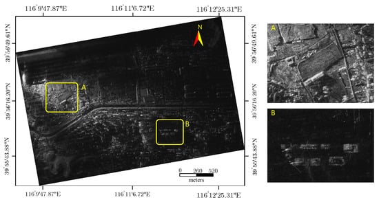 After performing the direct pulse phase history compensation and an inverse Fourier transformation, the range-compressed signal can be focused using the BiBulk_FFBP. In this experiment, the factorization factor is four, and the four subapertures in each of the four stages are summed into a new one. The focused result is shown in Figure 15. The magnified Areas A and B are also shown in the right panel. Area A is located in the near range of the receiver, from which a high SNR is consequently obtained. Because of the large incidence angle of the receiver, the tree canopies are clearly identified, and the track of an athletic field is easily recognized. Area B has some buildings that were still in construction at the time of data acquisition, and two tower slewing cranes are clearly focused. These details validate the focusing ability of the proposed BiBulk_FFBP.