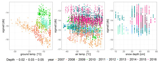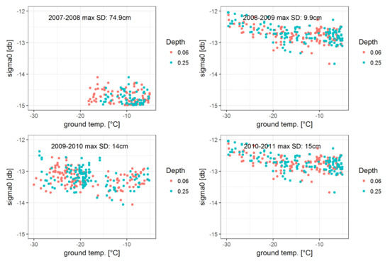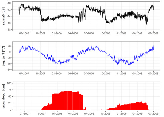 Overall, we did not find strong correlations between ASCAT backscatter and snow depth time series in this analysis. At C–band, depth hoar formation, which is itself closely related to temperature [76], could be more important [77]. It could also be hypothesized that while there is no direct relationship of snow depth and backscatter at C–band, that snow, if it reaches a certain depth, strongly influences the ground temperature regime [78]. This is amplified for sites where snow reaches a high level before the onset of the ground freezing [79]. An analysis of both the influence of depth hoar formation on backscatter and the influence of differing snow levels between years on the relationship of backscatter and ground temperature would require a more comprehensive dataset than currently available.