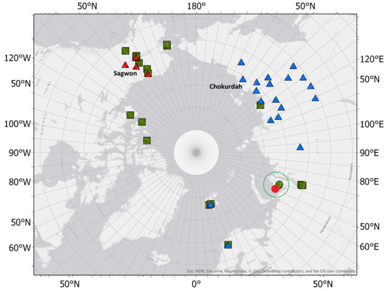 Overview of the studied sites for air temperature and snow depth dependency analysis of World Meteorological Organization (WMO) (blue triangle, air temperature and snow depth) and Snow Telemetry (SNOTEL) (red triangle, air temperature and snow depth) measurement sites; and the ground temperature dependency analysis of used GTN–P boreholes (green square, ground temperature) and boreholes from the Vaskiny Dachi research station on Central Yamal (green dots plus highlighted by green circle, ground temperature). The red circle marks the location of WMO station Marre Sale (Yamal, Russia), which is later used as a comparison.