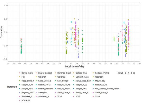 We confined our analysis to the winter period to exclude situations of wet snow and thawed ground. Wet snow is known to have different backscatter characteristics compared to dry snow [59,60], situations of melting snow were therefore excluded. For this purpose, we only included data from December to March for each year. To take additional precautions in avoiding thawing and freezing conditions a temperature limit of °C (daily mean value) was introduced for air temperature as well as ground temperature to exclude situations of melting snow occurring during the selected time period. To take influences of topography into consideration, backscatter values from ascending and descending orbits were treated separately. Additionally to the influence of topography, the acquisition time of the ASCAT backscatter data varies for ascending and descending orbits. To ensure maximum consistency between the different datasets, daily means of temperature measurements were used, as most time series were already given in this format. As we limited our analysis to winter periods, we assume backscatter values from mid–day acquisitions to be less representative of the daily mean. Figure 3 shows average acquisition times for both orbits for the locations of all considered boreholes. For stations where average acquisition times (as seen in Figure 3) during mid–day occurred, we excluded those results from further analysis and used only the evening or night–time measurements. For stations where neither orbits had average acquisition times during mid–day (Banks_Island and Mould_Bay), mean values of the correlations of both orbits where used in the final analysis.