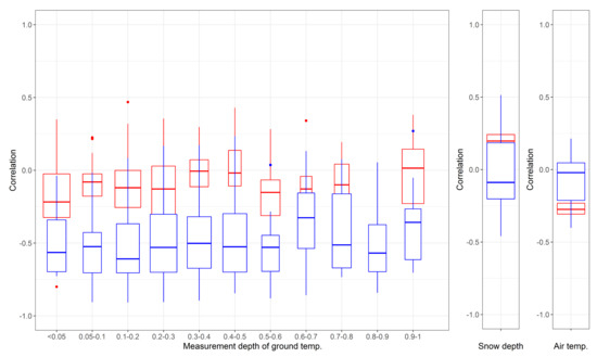 Correlations of ASCAT backscatter values with ground temperature (grouped for different depths (m)), snow depth and air temperature; red and blue represent study sites with freezing degree days above (blue) and below (red) 4000 degree–days, and the variable width of the boxplots represent the relative number of available data points within one group; outliers are represented by the dots.