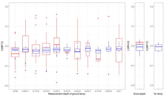 Figure 5 shows the results of the ANCOVA analysis in form of the estimated parameters for backscatter dependencies on ground temperature (grouped for different depths), snow depth and air temperature using separate axis for the three parameters due to the different units. The results show no significant differences between the two groups of sites with freezing indices above or below 4000 degree–days for all of the three variables. Additionally, there are no significant differences for the results for ground temperature in different depths. Except for outliers, the results for all depth groups as well as for both the group with higher (≥4000 degree–days) and lower (<4000 degree–days) freezing indices have values close to zero. The estimated parameter for ground temperature (d) varies mainly between 0.15 dB/°C and −0.15 dB/°C. Snow depth (c in dB/cm) and air temperature (b in dB/°C) show similar numbers, however these parameters are not directly comparable as they have different units. The estimated parameter for ground temperature however shows larger variations (for most depth groups) compared to the other variables (see Figure 5).