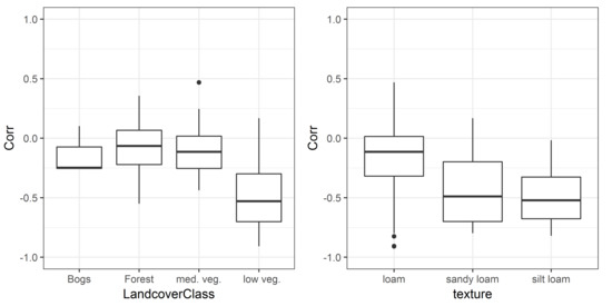 The influence of landscape and soil type on ground temperature is shown in Figure 8. The comparison (as shown in Figure 8) shows that points with low vegetation have higher (negative) correlations between ASCAT backscatter and ground temperature compared to other landcover classes. Points with soil textures sandy loam and silt loam have the lowest median correlations, compared to all present classes. The estimated parameter for ground temperature shows fewer differences between the groups (for landcover and soil texture), however the landcover class medium vegetation and the soil texture class loam show a high number of outliers.