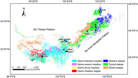 Grasslands are one of the most widespread vegetation types and store one-fifth of the total global carbon in its vegetation and soil [1,2]; thus, they play an important role in the global carbon cycle. The extensive grasslands in China make up ~10% of the total area of grasslands in the world and have been estimated to store 9–15% of the total carbon held in the grasslands worldwide [3]. Northern China’s grasslands located in the Tibetan Plateau and Inner Mongolian Plateau, in particular, constitute the majority (more than 70%) of the grasslands in China and represent two significant grassland types worldwide (i.e., alpine and temperate grasslands) [4]. Moreover, they are sensitive to climate changes due to their unique plateau topography, the extreme cold, arid and semi-arid ecological environment and the high soil carbon density [5,6,7]. Therefore, a better understanding of the carbon cycle in northern China’s grasslands is necessary for it to serve as a sensitivity indicator of regional and global carbon cycles.