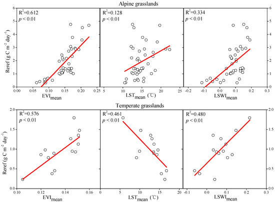 Although temperature has been noted to be positively correlated with RE across biomes at a global scale [40,41] and an important limitation on RE in alpine ecosystems, the inclusion of LSTmean does not significantly affect the explanation of Reref variation (Table 4). In the alpine grasslands, studies increasingly suggest that plant biomass is the direct determinant of RE distribution [61,62,63], while moisture changes, but not temperature, serve as another indirect determinant via regulating plant growth and distribution in the vast alpine grasslands (4400–4800 m) [64]. The above two explanations describe how temperature is less important to governing the spatial pattern of RE in the alpine grasslands. However, the dependence of Reref on LSTmean appears to be stronger and negative in the temperate grasslands (Figure 3, Table 2). In fact, the relation of RE with temperature can be confounded by moisture in arid and semi-arid ecosystems [63,65]. Specifically, the gradient of precipitation mainly defines the declining gradient of RE from the northeast to the southwest in the Inner Mongolian Plateau, which is exactly opposite to the gradient of temperature [66], thus leading to the apparently close and negative spatial correlation between temperature and RE.