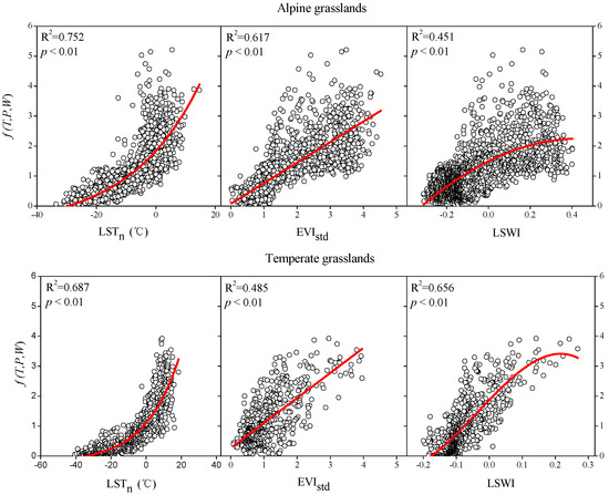 f (T,P,W) response to nighttime LST (LSTn), standardized EVI (EVIstd), and LSWI for the Tibetan alpine grasslands and the Inner Mongolian temperate grasslands.