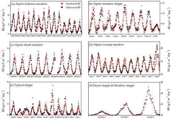 Comparison between the observed and predicted ecosystem respiration (RE) in the Tibetan alpine grasslands (left) and the Inner Mongolian temperate grasslands (right).