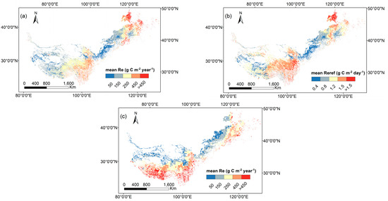 Reref appears to be a key component in this model in terms of quantifying the spatial variability of RE across sites. Nevertheless, the spatial patterns of Reref have rarely been investigated due to the lack of spatially explicit algorithms to allow the upscaling of Reref. Here, we took abiotic and biotic factors into consideration to parameterize Reref spatially and revealed that the mean annual Reref has a clear spatial heterogeneity among different vegetation types in northern China’s grasslands (Figure 7b), ranging from 0.22 g C m−2 day−1 in the desert steppe to 2.25 g C m−2 day−1 in the meadow steppe. In addition, the spatial distribution of Reref, to a large extent, determines the spatial pattern of the mean annul RE (Figure 7a,b).