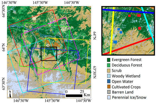 Our test site, illustrated in Figure 1, is located in Delta Junction, interior Alaska. The area is mostly covered by forest and shrub landscapes [24] and underlain by dis-continuous permafrost. The Alaskan interior between the Alaska and Brooks Mountain Ranges has a strong continental climate with moderate temperatures and precipitation in summer and exceedingly cold and dry weather in winter [25]. The average minimum and maximum annual temperatures in Big Delta station (1937–2005), which is located in the study area, are −6.9 °C and −2.7 °C, respectively. The lowest and highest temperatures occur in January (−23.7 °C) and July (20.8 °C). Average total precipitation, average total snow-fall, and average snow depth are, respectively, about 29, 111.25, and 10.2 centimeters (National Weather Service (http://www.wrcc.dri.edu)).