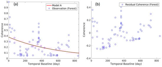where subscript A denotes model A, γ0 is initial coherence, t is the time separation between two SAR images, and 1/τ is its decorrelation rate and is mainly dependent on the wavelength of the radar. Based on model A, the exponential decay of coherence values is expected in general by increasing the temporal baselines. However, the scatter plots of the observed coherence versus temporal baseline and the scatter plots of the residual coherence, i.e., observation—model A, versus the temporal baseline, illustrated in Figure 2, feature strong undulation with local peaks at temporal baselines around one and two years. Model A takes into account decorrelations due to long-term variations of the scatterers’ geometry. In the real world, however, in addition to the natural and gradual long-term changes in the scatterers’ geometry, seasonal and/or sudden changes in surface backscattering parameters may also contribute to temporal decorrelation. Generally, backscattering is dominated by the surface dielectric constant and roughness among other surface characteristics. Surface parameters, such as soil moisture, vegetation, and temperature alter dielectric constant and roughness and, consequently, backscattering coefficients (e.g., [17,22,32]). Therefore, other term(s) should be added to the temporal coherence function to compensate the effects of changes in surface backscattering between two image acquisitions.