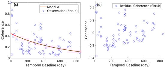 Scatter plots of observations and model A for forested (a) and shrub (c) land cover types. Scatter plots of residual coherences (observation—model A) for forested (b) and shrub (d) land cover types.